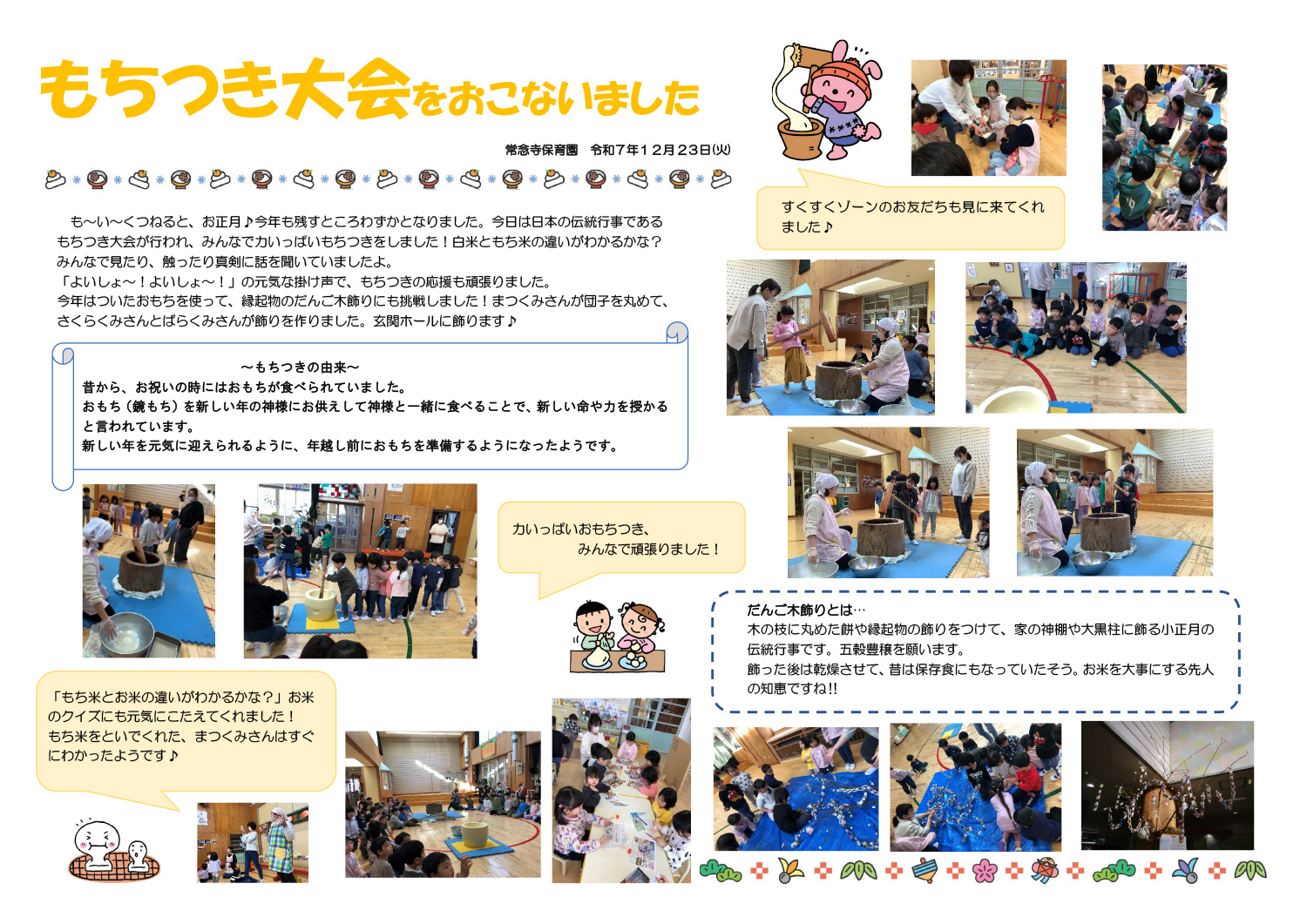 みんなで力いっぱい、もちつき大会! 2025 12/23 ニュースリリース 2025年12月23日 12/23(火)にもちつき大会が行われました。子どもたちみんなが杵をついてお餅ができました。詳しくはお便りをご覧ください。 ニュースリリース 2026年1月 支援センター行事案内 関連記事 成道会(じょうどうえ)のお祝いをしました。 2025年12月23日 みんな一緒にノンアレルゲンおやつを楽しみました。 2025年12月9日 大きな感動、幼児音楽フェスティバル! 2025年12月9日 『七五三のお祝い会』を開催しました。 2025年11月15日 第40回 第1学区コミセン文化祭に参加しました 2025年11月11日 第一学区コミュニティーセンターに園児作品を展示します。 2025年11月7日 市内4保育園合同企画のサッカー教室を開催しました。 2025年11月2日 親子行事『うんどうのひ』を開催しました。 2025年10月16日
