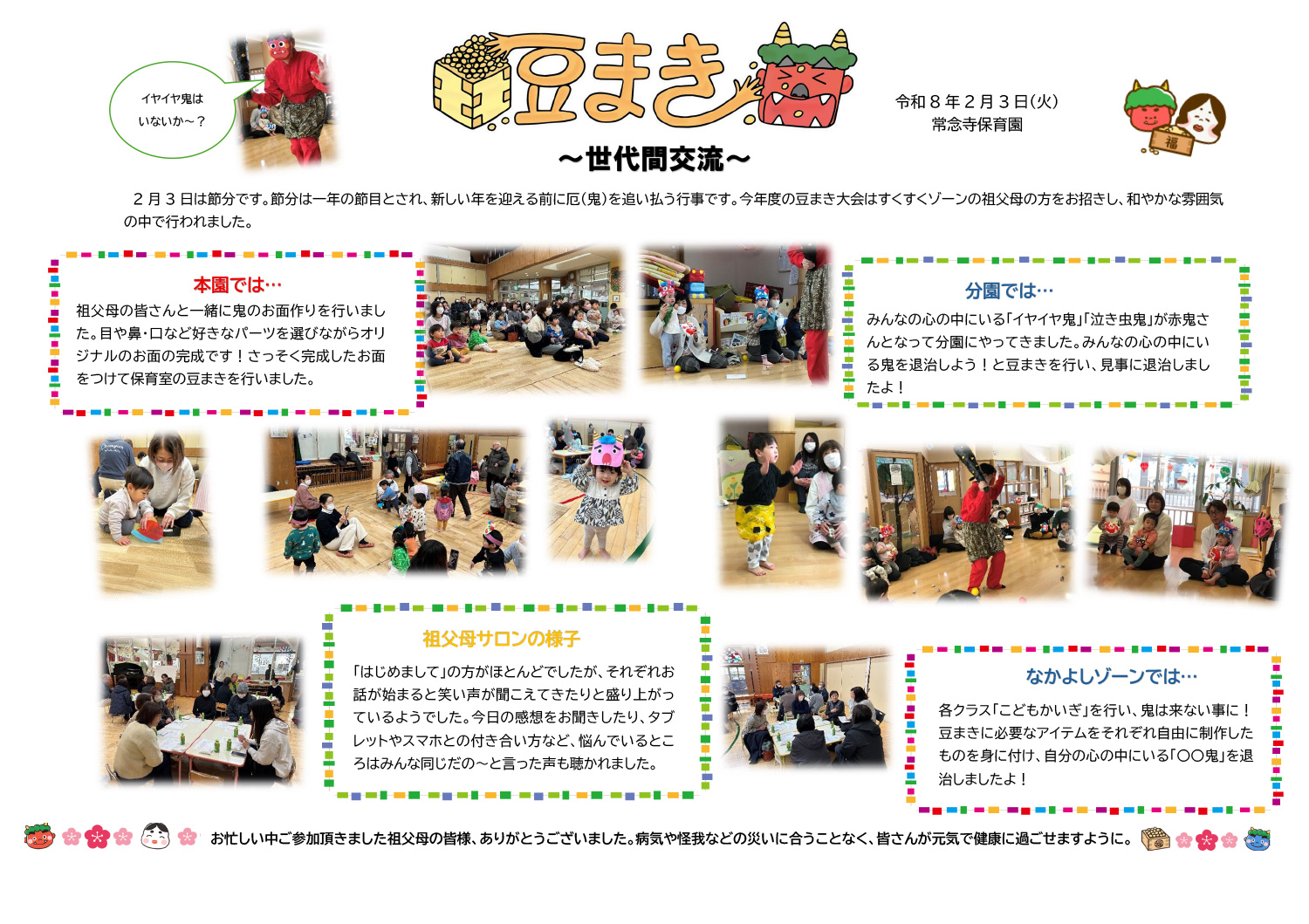 2月3日は節分。保育園でも0~2歳児の祖父母の皆様をお招きして豆まきを行いました。