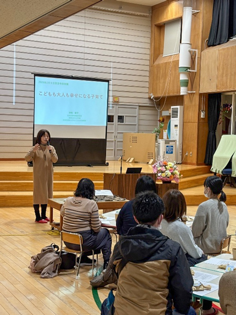 乳幼児教育実践研究家 保育SoWラボ代表 非営利団体コドモノミカタ代表理事である「井桁容子先生」が2月9日に常念寺保育園においでになり、保護者会での講演会「こどもも大人も幸せになれる子育て」と題して講演をいただきました。お父さん・お母さんの日頃の悩みを井桁先生に聞いてもらい、こどもが安心して育つために「ごきげんな大人」になりたい、という感想がありました。