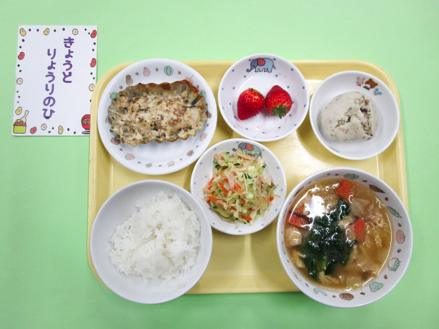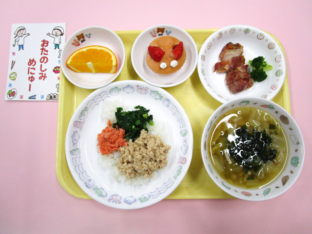12日の昼食とおやつは『まつくみ希望献立』です。今まで保育園で食べた給食の中から、もう一度食べたいメニューをまつくみさんが選んでくれます。何のメニューに決まったかは当日までのお楽しみです。玄関の食育コーナーにサンプルが展示されるので、ぜひお子さんと一緒に見てくださいね♪